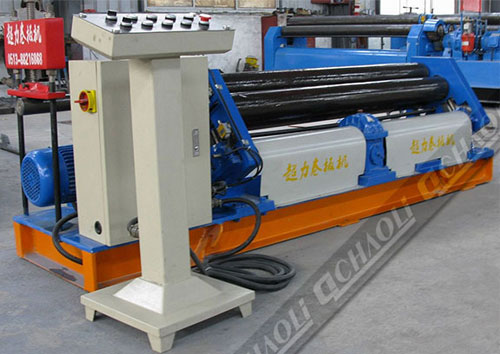 該機結構型式為三輥非對稱式,下輥為主傳動,并做垂直升降運動,以便夾緊板材。通過下輥齒輪與上輥齒輪嚙合,同時作為主傳動,側輥作傾升降運動。具有預彎、卷圓多重功能,結構緊湊操作維修方便。
